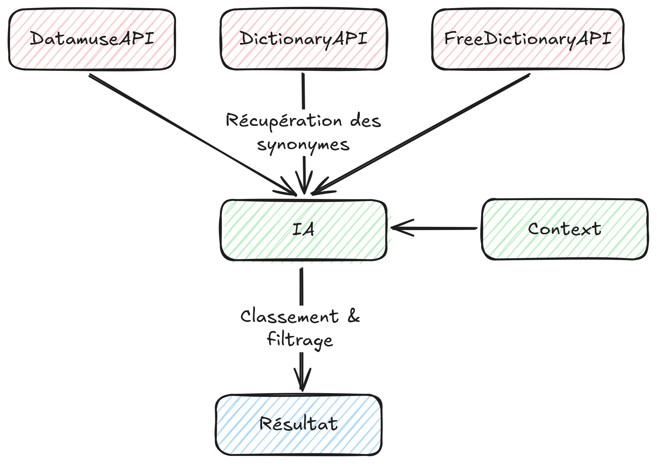 Malheureusement, après avoir fait plus de tests, la qualité des synonymes laissait à désirer, principalement parce que les API ne renvoyaient pas des synonymes de qualité en premier lieu, problème que le filtrage ne suffisait pas à résoudre. La dépendance à des API est aussi problématique car elle nécessite une connexion internet et suppose que les API soient fonctionnelles. Nous avons donc décidé de changer de méthode, comme présenté dans la partie suivante.