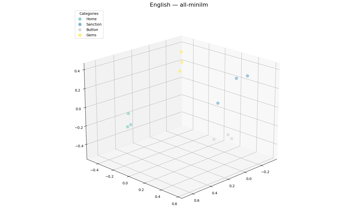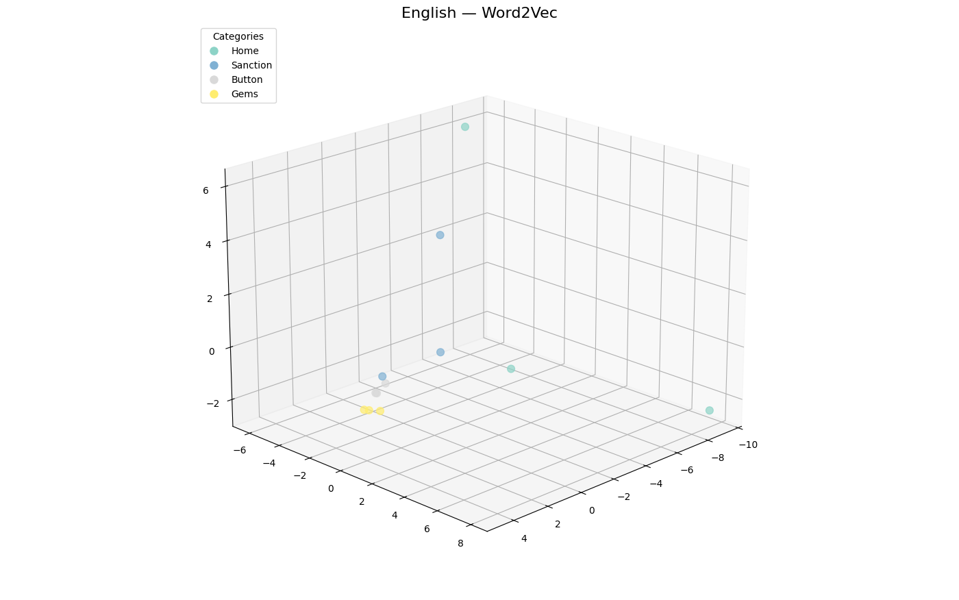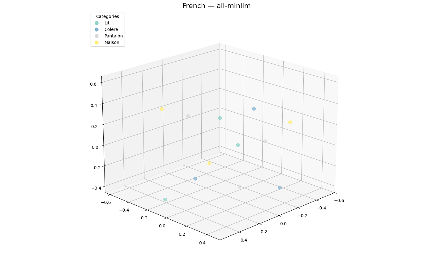 On peut voir que, pour Word2Vec deux groupes (« gems » et « button ») sont bien regroupés, mais pas les deux autres. Pour MiniLM, les groupes sont bien regroupés en anglais, mais pas en français.